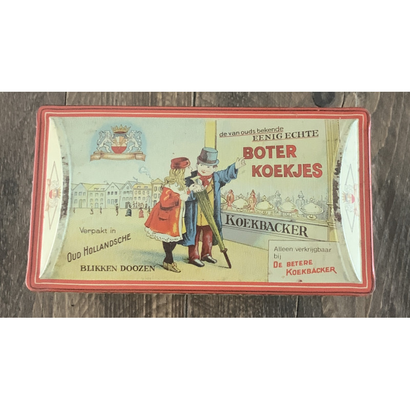 De van ouds bekende, enige echte boterkoekjes Koekbacker. Alleen verkrijgbaar bij de betere Koekbacker. Verpakt in oud Hollandsche blikken doozen.