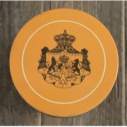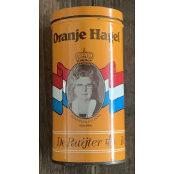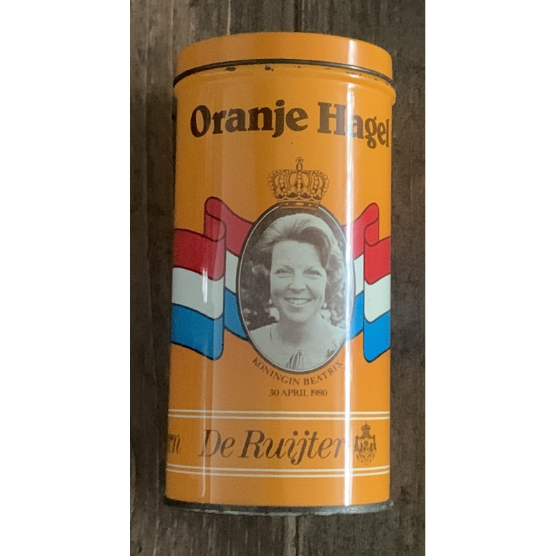 Rond hagelslagblik met los deksel, “De Ruijter, Oranje Hagel”, oranje